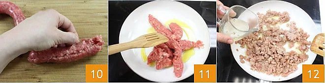 Now focus on the filling: skin the luganiga sausage 10, place it in a pan with a drizzle of oil 11 and cook for a few minutes until browned. Deglaze with the beer 12 and continue cooking for 15 minutes, turn off the heat and let cool.