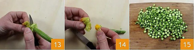 Now clean the zucchini flowers: detach them from the zucchinis by cutting at the base 13 and remove the central pistil 14, then cut the zucchinis into thin slices 15 and place them in a bowl with a pinch of salt to remove excess water.