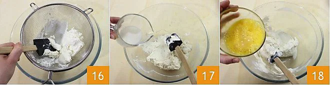 In another bowl, place the ricotta after passing it through a fine mesh strainer to make it creamy 16. Add the milk to further soften the ricotta 17 and the beaten eggs 18 then mix everything well.