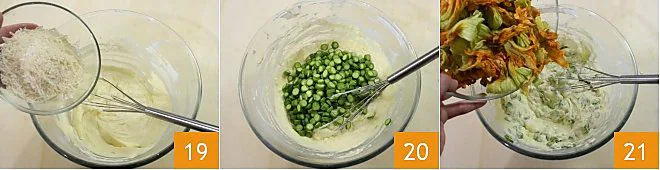 Add the grated Parmesan cheese 19. Drain the zucchinis to remove excess water, add them to the ricotta mixture 20 and stir to incorporate. Also add the zucchini flowers 21