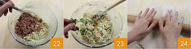 and the sausage 22, mix then season with salt and pepper to taste and add the marjoram leaves 23. At this point, take the shortcrust dough, take 2/3 of the dough to form the base and roll it out with a rolling pin to a thickness of 0.4 inches 34.