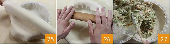 Place the rolled-out dough on a 10-inch diameter pan lined with baking paper that has been moistened and squeezed (to soften it so it adheres better to the pan), using a rolling pin 25; remove the excess edges by rolling over the surface with the rolling pin and pressing slightly 26 and fit the dough inside, pressing well along the edges. Pour the ricotta, sausage, and vegetable mixture into the tart pan 27. Level the mixture with a spoon or spatula.