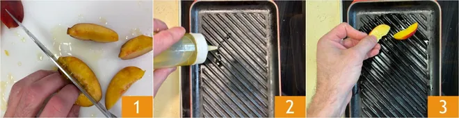 To prepare the crostini with hummus, grilled peaches, feta, and arugula, start with the peaches: cut them in half and slice them into wedges about 3/4 inch thick 1. Grease a well-heated grill 2, place the peach wedges 3 and let them brown for a moment on one side 3.