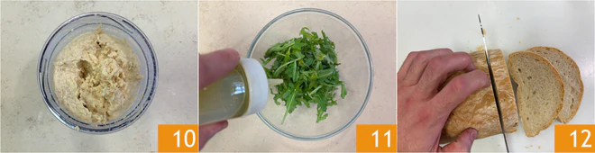 Blend until you obtain a creamy mixture 10. Set the hummus aside and dress the arugula with oil 11. Finally, slice the bread into slices about 3/4 inch thick 12.