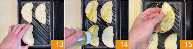 Place the bread slices on the same grill where you cooked the peaches 13 and drizzle some oil on the surface 14. Turn the slices to the other side as soon as they are toasted 15.