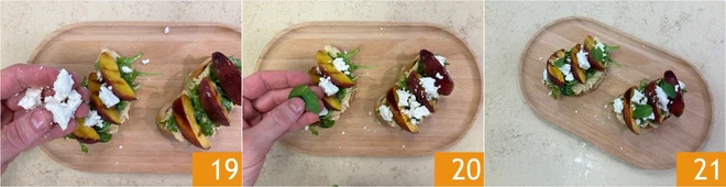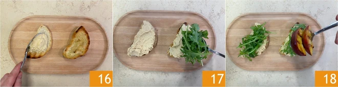 You are ready to assemble the crostini: spread the hummus on the bread slices 16, then add the arugula 17 and grilled peaches 18.