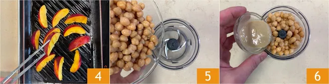 Turn the wedges and grill them on the other side 4. Proceed with the hummus: in a blender, add the drained and rinsed chickpeas 6, then add the tahini 6.