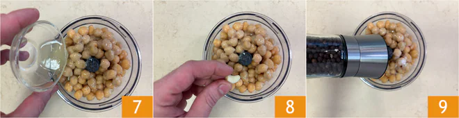 Also add the lemon juice 7, garlic 8, salt, and pepper 9.