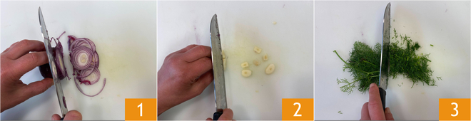 To prepare the crostino with marinated anchovies, first slice the onion 1 and the garlic 2. Finely chop the fennel 3.