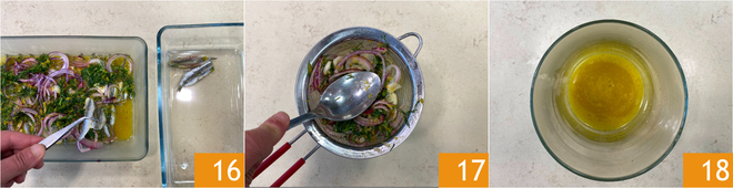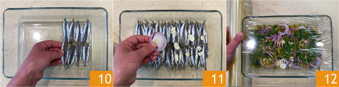 Place the cleaned and butterflied anchovies in a baking dish 10, lay the onion and garlic on top 11. Pour the previously prepared mixture over the anchovies. Cover with plastic wrap and let it rest in the fridge for at least one hour 12.
