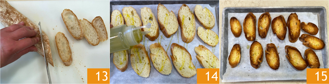 Slice the baguette 13, transfer the slices onto a baking tray lined with parchment paper, drizzle with a little oil 14 and toast in the oven at 350°F for 15 minutes, or until golden 15.