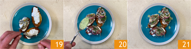 Place the crostini on a serving plate and top with hand-torn burrata, lay the anchovies on top 19. Decorate with onions and fennel, and finish with the mint marinade 20. The crostino with marinated anchovies is ready to be enjoyed 21.