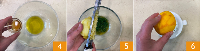 Add the juice of one lemon 7, season with salt and pepper 8, and mix 9.