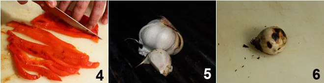 First, grill the peppers directly over the coals 1 until the skin is burned 2; they should have a soft yet still crunchy texture. Place in a container, cover with plastic wrap, and let them sweat. This process will make it easier to remove the pepper's skin. Then peel them and remove the seeds and internal filaments 3.
