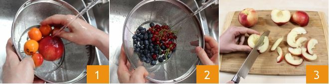 To prepare the crumb cake with summer fruits, start with the fruit: wash it carefully under running water (1-2) and gently dry it with a cloth. Remove the currants from the stalks and set them aside along with the blueberries. Then place the peaches on a cutting board, cut them in half, remove the pit, and slice them 3.