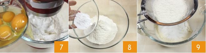 While continuing to whisk, add the room temperature eggs one at a time 7 and continue for another 2-3 minutes. After this time, mix the baking powder and flour 8 and incorporate them, sifting them, into the butter and sugar mixture 9. Then blend everything with a spatula, until the consistency of the mixture is similar to that of a donut batter.