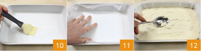Butter a 9x13 inch rectangular pan using a brush 10 and line it with parchment paper 11; to learn how to perform this operation best, consult the Cooking School: how to line a baking pan with parchment paper. At this point pour the batter into the pan and level it with the back of a spoon 12.