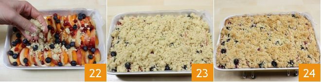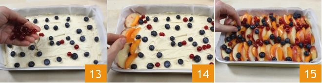 Now take the washed and sliced fruit you set aside. Scatter half of the blueberries and half of the currants over the surface 13, then proceed by arranging the peach and apricot slices randomly or in alternating rows 14 and finish by adding the remaining half of the currants and blueberries 15.