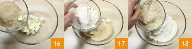 Now prepare the crumble: in a bowl, pour the cold butter cut into cubes and add the brown sugar 16. Also, add the all-purpose flour 17 and almond flour 18.