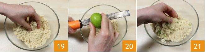 Mix with your fingertips, trying to combine everything by crumbling it and not insisting too long to avoid melting the butter, and add two large pinches of salt 19. Grate the zest of a lime into the mixture 20 and continue to combine with your fingertips 21.