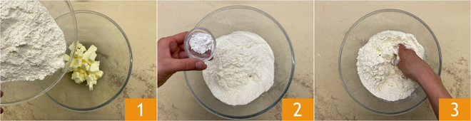 To prepare the crumble cake with jam, place the cold butter cut into cubes, the flour 1, and the baking powder 2 in a bowl, and start crumbling the mixture with your hands 3.