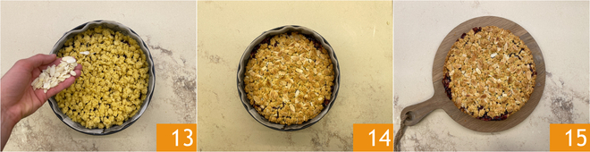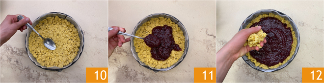 Compact the bottom with your hands or the back of a spoon 10 and also form the edge. Spread the jam 11 and cover with the remaining crumbs 12.