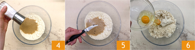 Add the sugar, a pinch of salt 4, and the vanilla seeds 5. Finally, incorporate the eggs 6.
