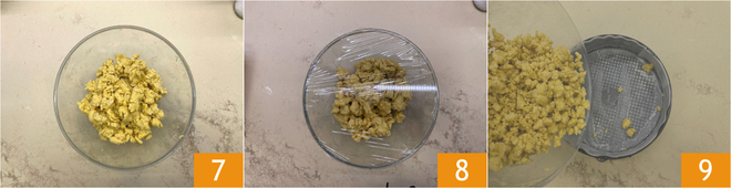 Continue to crumble the mixture to form coarse crumbs 7, cover with plastic wrap, and place in the fridge for 1 hour 8. Line a 9-inch springform pan with parchment paper, pour 2/3 of the dough into the pan 9.