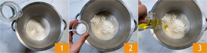To prepare the crunchy pumpkin and cheese focaccia, start with the dough: pour the water, flour 1, salt 2, and extra virgin olive oil 3 into the bowl of a stand mixer.