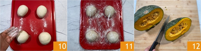 Place the 4 portions of dough on a lightly floured tray 10, cover with plastic wrap 11, and let rest in the refrigerator for one hour 11. Meanwhile, prepare the pumpkin: cut it in half 12.
