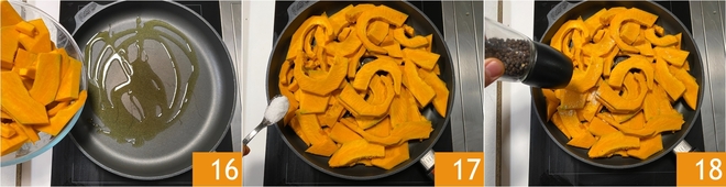 Place the pumpkin in a pan with a swirl of hot oil 16, then season with salt 17 and pepper 18.