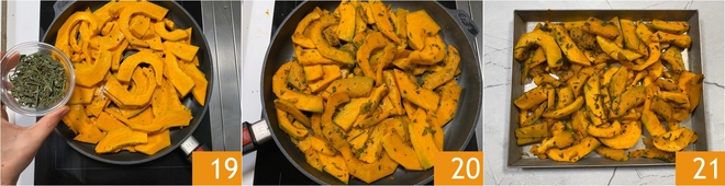Season with chopped thyme, sage, and rosemary 19 and cook over medium heat for 10 minutes, adding water as needed 20; it shouldn't be fully cooked. After cooking, transfer the pumpkin to a baking sheet to let it cool slightly 21.