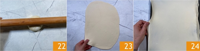 Take the dough from the fridge and start rolling out the 12.35 oz portion 22 until you have a sheet the same size as the baking tray 23: we used a 16x12 inch baking sheet. If the dough shrinks, let it rest for another 5 minutes. Lay the sheet in the baking tray and gently stretch it to cover the edges 34.
