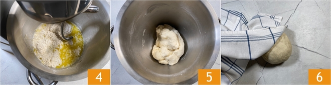 Start the mixer with the hook at medium speed 4 and knead until the mixture is well combined 5. Let the dough rest at room temperature for 20 minutes, covered with a cloth 6.