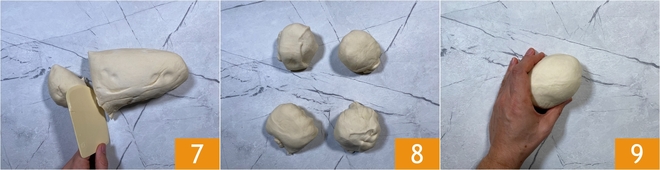 After the resting time, take the dough and divide it with the help of a dough scraper 7: you should get 2 portions weighing 12.35 oz (for the base) and 2 balls weighing 10.58 oz (for the surface) 8. Shape each ball on the work surface 9.