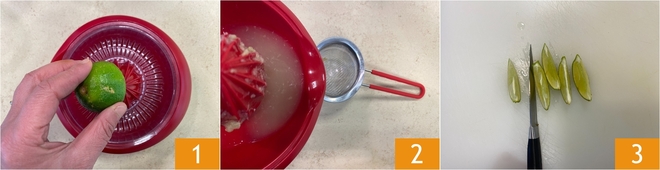To prepare the Cuba Libre, start with the lime. Squeeze its juice using a citrus juicer 1 and pass the obtained liquid through a strainer 2. Cut the lime into wedges 3 to use for garnishing the cocktail.