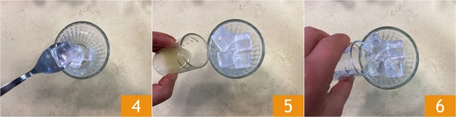 In a highball glass, add ice cubes 4, pour in half of the lime juice 5, and also add half of the white rum 6.