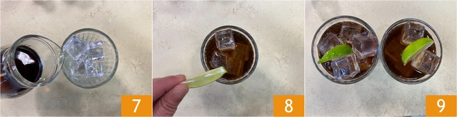 Now, you only need to pour the Coca-Cola 7. With our quantities, you will get 2 cocktails. Garnish and scent your cocktail with lime wedges 8, and you can already enjoy your refreshing Cuba Libre 9!