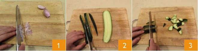 To prepare the cucumber and yogurt cream, start by preparing the Vegetable broth. Then wash and dry the vegetables. Next, clean and finely chop the shallot 1. Trim the cucumbers, cut them into slices 2, and then into small cubes 3: set aside.