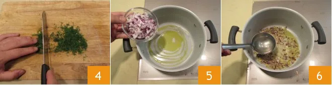 Now finely chop the dill 4 and set it aside. Everything is now ready for preparation. Take a non-stick pot with high sides. Sauté the shallot with a drizzle of oil 5. Stir it occasionally for even cooking until it turns golden. Then deglaze with a ladle of water 6.