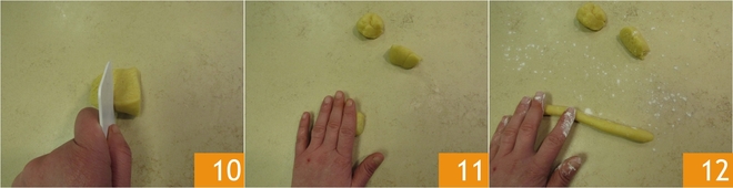 Divide it into 3 parts 10. Take the first portion and, using a little flour, form a stick 11 12.