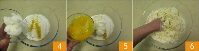Add the lard 4 and the slightly beaten eggs 5. Start mixing in the bowl with your hands 6.