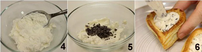 For the ricotta and chocolate filling, beat the ricotta with the powdered sugar and the teaspoon of cream 4 until you obtain a creamy mixture, at this point, add the chocolate shavings 5 mixing well. Fill the little hearts with the ricotta and chocolate cream 6 and cover them with chocolate shavings you have set aside.