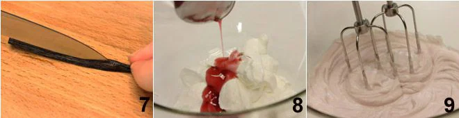 For the cherry and chantilly filling, start by preparing the chantilly with the ingredients listed above and Chantilly cream for the procedure 7. Once ready, add 4 tablespoons of cherry syrup 8, continue to whip the cream 9, and fill the little hearts. To complete, cut cherries in half (or if you prefer leave them whole) and place them on each little heart to decorate. Happy Valentine's Day!