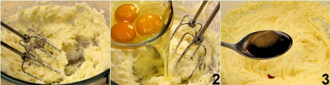 To prepare the coffee and mascarpone cupcakes in an original way, I thought of baking them in silicone cups shaped like coffee cups, but alternatively, you can also bake them in classic paper cups and then place each cupcake in a cup. With a mixer, work the butter (at room temperature) into a cream together with the sugar and vanilla bean seeds 1, then add the eggs (also at room temperature) one at a time, always beating and mixing the ingredients well before adding the next egg 2. Also add the lukewarm coffee 3