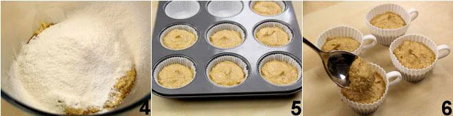 and finally the flour previously mixed and sifted with the baking powder 4. Divide the obtained mixture into 12 paper cups placed inside the cupcake mold 5 or into silicone cups shaped like coffee cups 6 and bake at 350°F for about 25-30 minutes in a static oven (before removing them, do the toothpick test to ensure they are cooked).