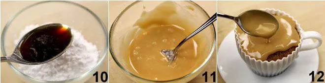 A few minutes before removing the cupcakes from the oven, prepare the coffee glaze by mixing in a bowl 2 cups of powdered sugar together with the boiling espresso 10; mix until you get a thick mixture 11 (if it's not thick enough, add a little more powdered sugar, and if it's too thick, add a bit more coffee). As soon as you take the cupcakes out of the oven, cover them while still hot with the glaze and let them cool 12.