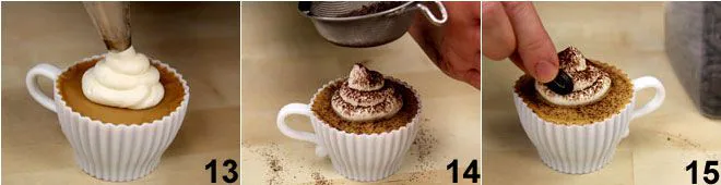 Remove the mascarpone mixture from the refrigerator and gently pour it into a piping bag fitted with a smooth nozzle about ⅓ inch in diameter and create a spiral of cream in the center of each coffee cupcake 13, which you will sprinkle with unsweetened cocoa 14. Garnish each cupcake with a couple of chocolate coffee bean-shaped chocolates 15 and accompany each "cup" with a chocolate spoon.