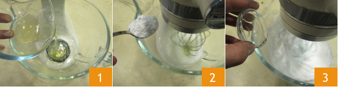 To make the cups with lemon cream and meringues, first, prepare the meringues: in the bowl of a stand mixer, start working the room-temperature egg whites with a pinch of salt 1, as soon as they start to turn white, add the sugar gradually 2 and a few drops of lemon juice 3.