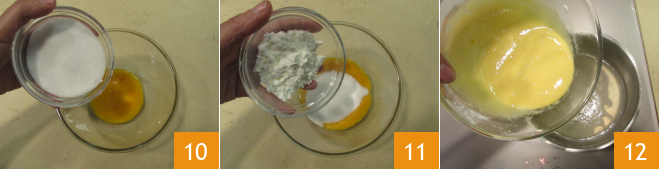Meanwhile, in a bowl, mix the egg yolks with the sugar 10 and cornstarch 11. Temper the mixture with a small part of the hot juice, then pour all the egg mixture into the hot lemon water 12.